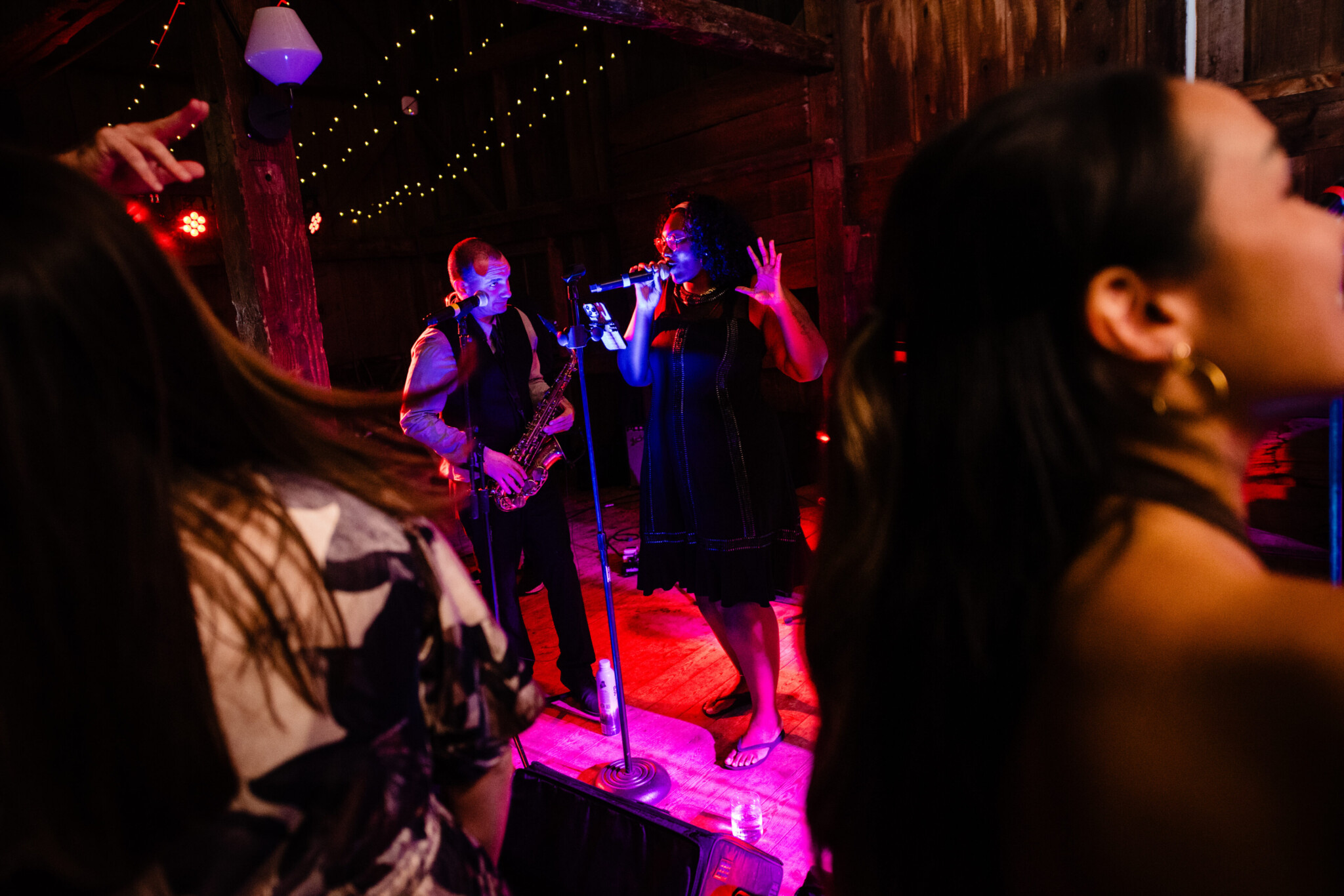 East Coast Soul’s role for this one was all about vibe and flow: ceremony sound support at the outdoor site, an upbeat jazz trio for cocktail hour, a small combo for dinner, and then a full-on dance party in the main dairy barn to close out the night. Amie and Greg were very clear about one thing: they wanted a packed dance floor and a party that built all night, moving from Motown and soul into rock anthems and modern bangers, with as few slow songs as possible.