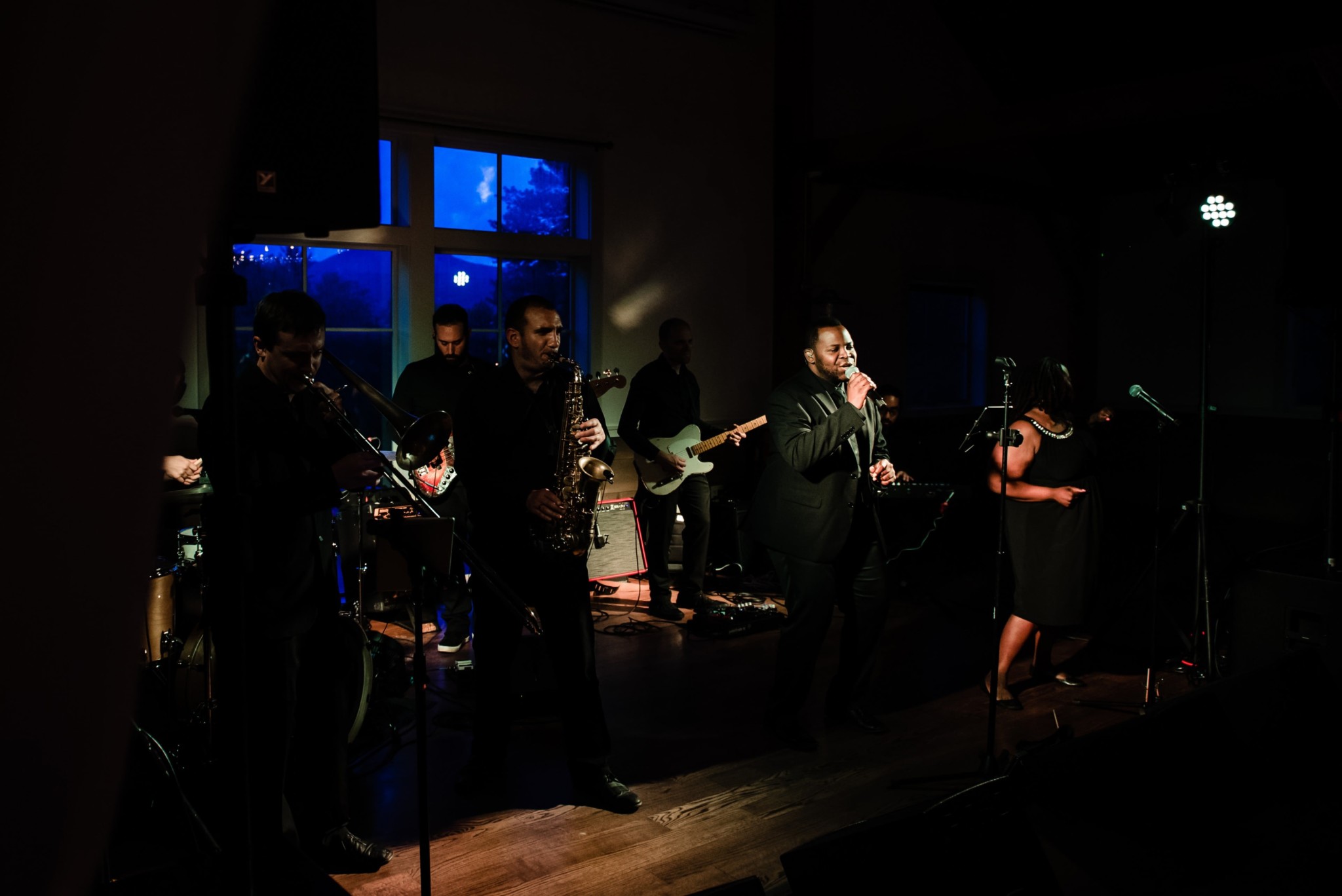 The bride and groom's first dance is almost always one of the most meaningful parts of the wedding. It's an opportunity for the bride and groom to take a moment for themselves. With this portion of the wedding finished, the guests and vendors took a break for dinner. After as short a break as possible, East Coast Soul's Soulsville ensemble circled back to the stage.