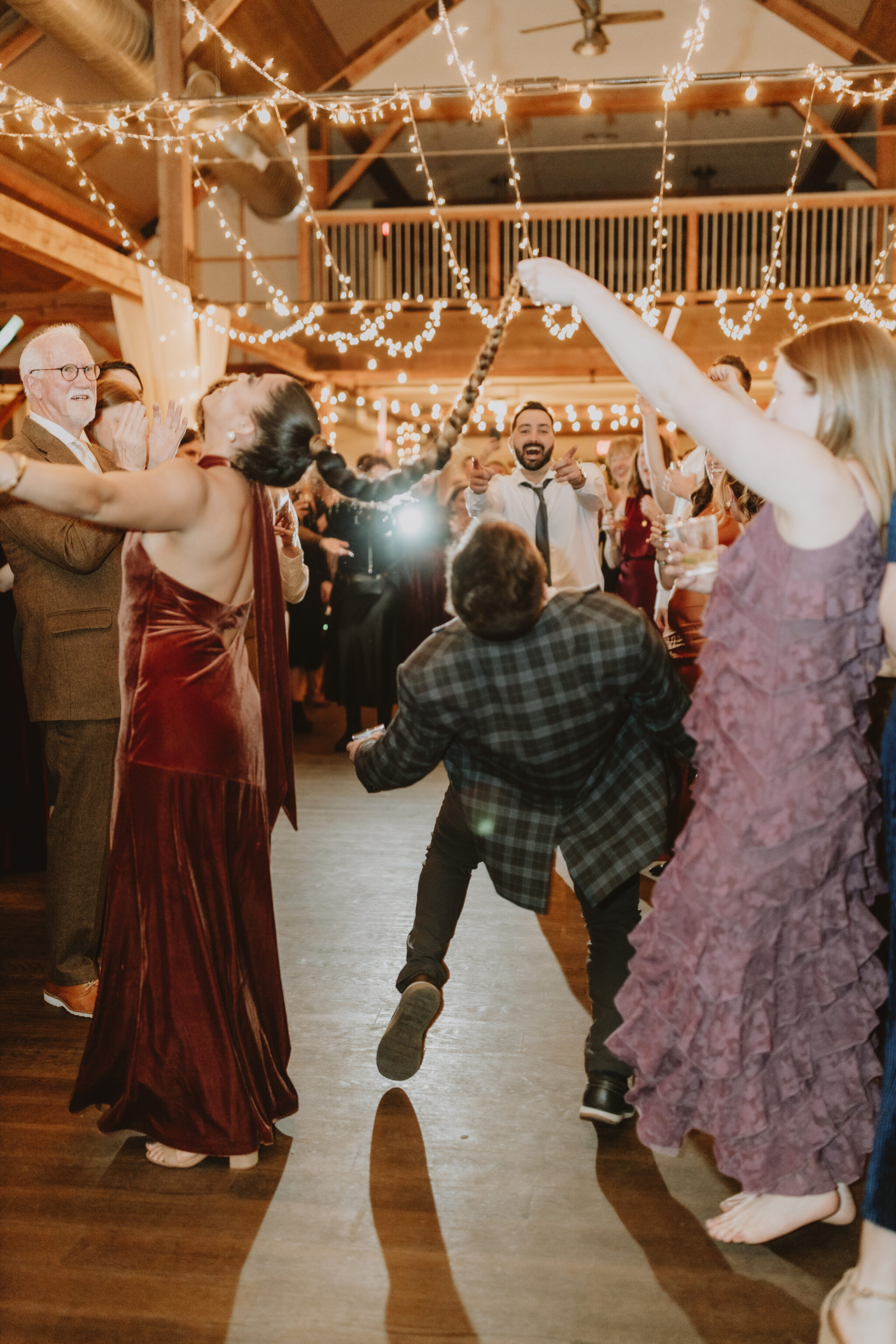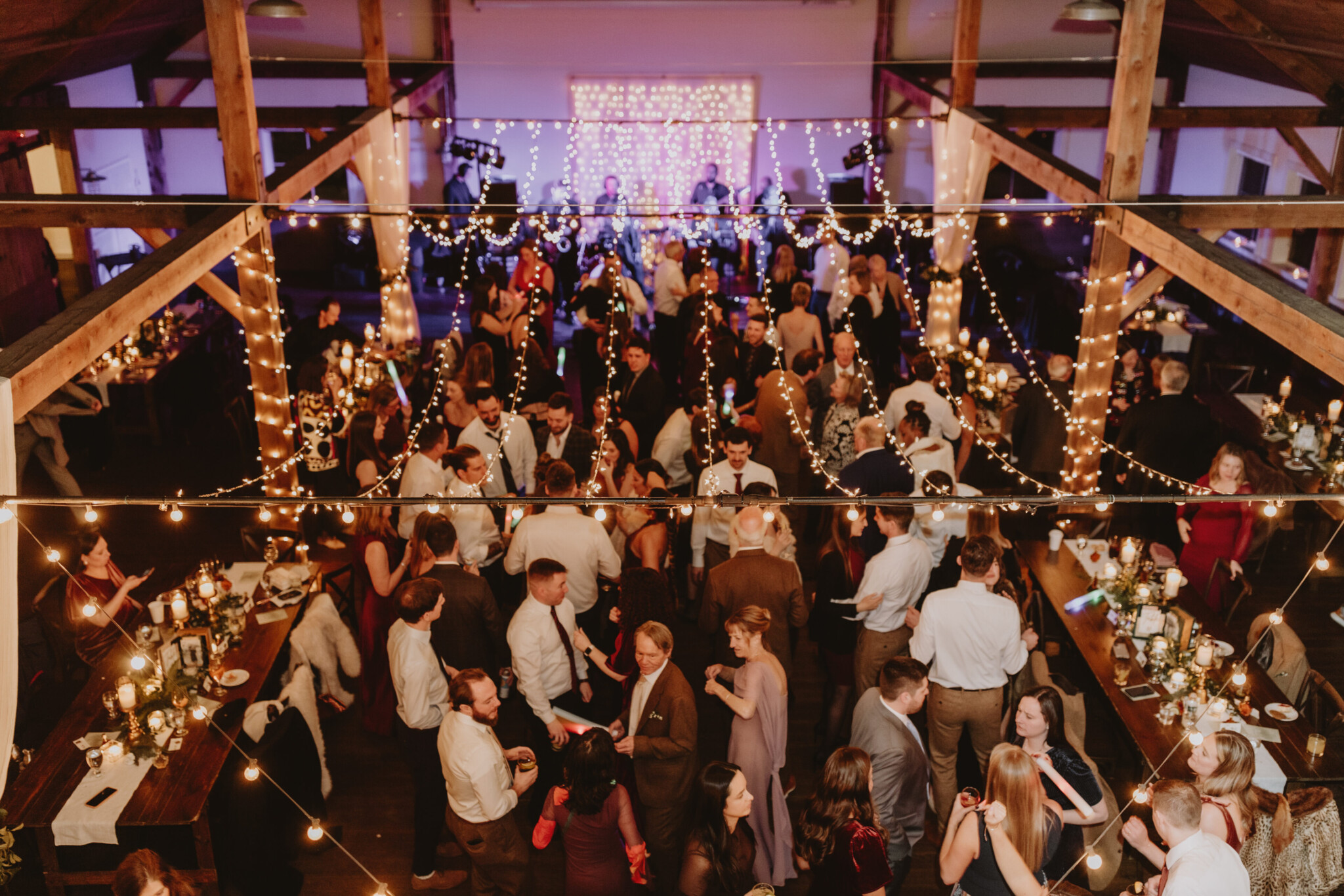 Rustic barn wedding reception with guests dancing under warm string lights and wooden beams.