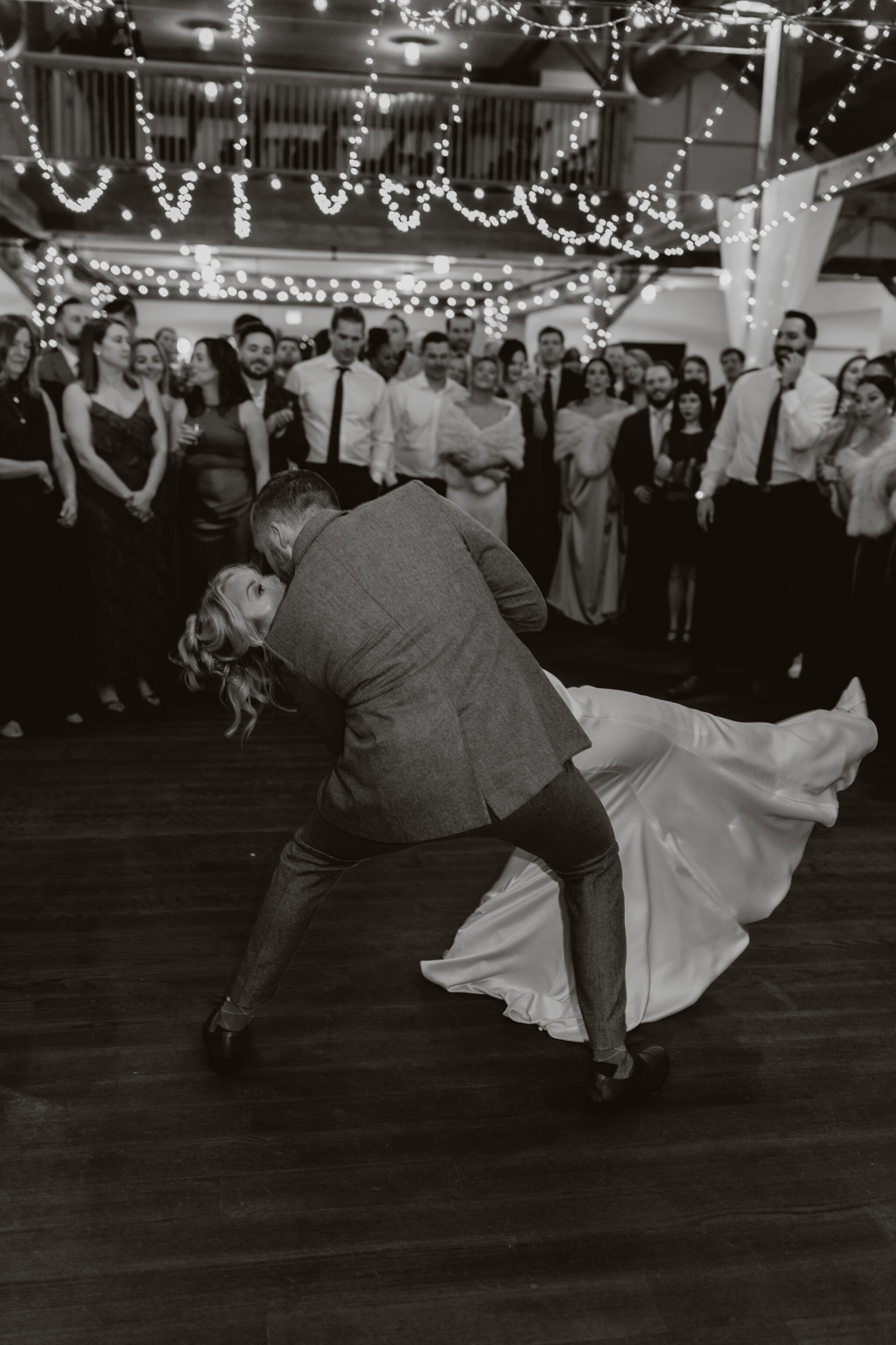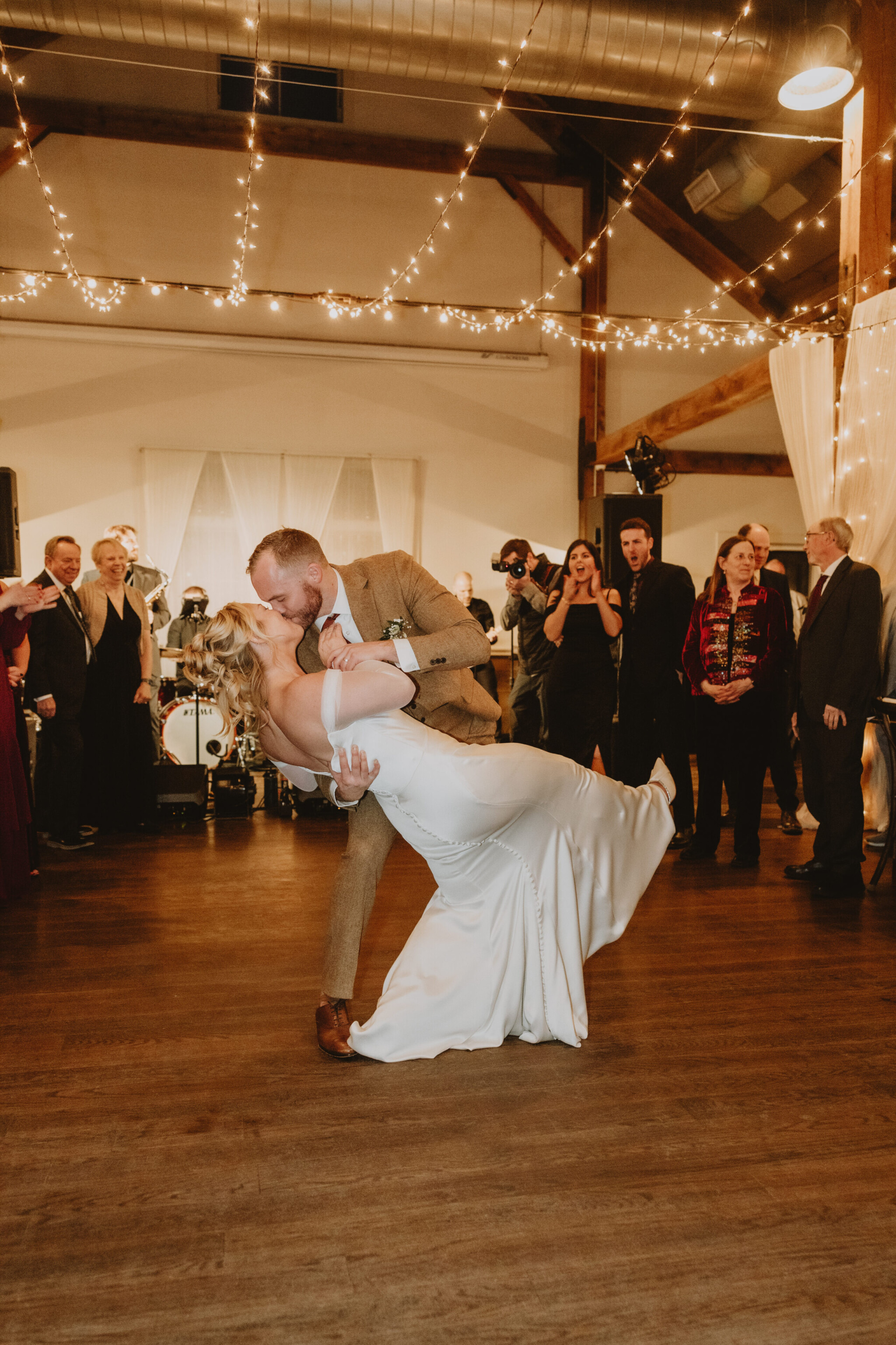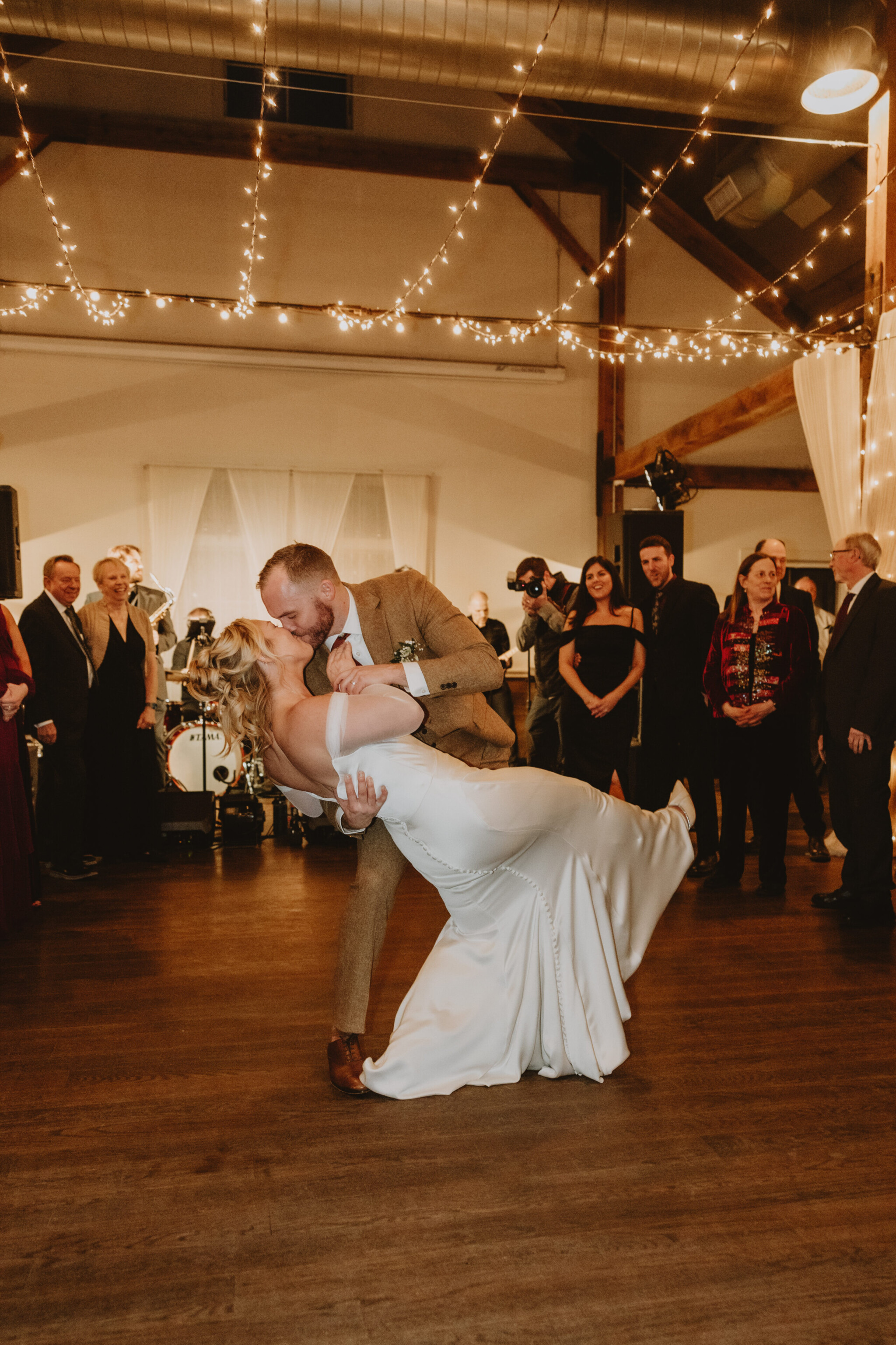 As the entrance song wrapped, guests stepped back to create a ring around the dance floor so Brett and Shelby could share their first dance. They chose “Beyond” by Leon Bridges,” performed live and trimmed just a bit for pacing. After the high-energy entrance, this felt like the perfect grounding moment — quiet, emotional, and intimate.