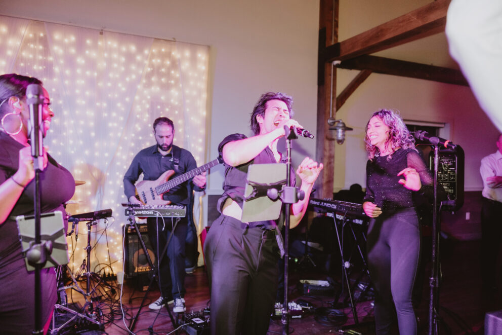 Guests were invited to line the dance floor, creating a runway of sorts. We introduced the couple (with the proper “Blackiston — like ‘tin’” pronunciation!), and they entered to “A Good Night” by John Legend,” which we played live. Their families and wedding party were right behind them, and the place instantly turned electric.