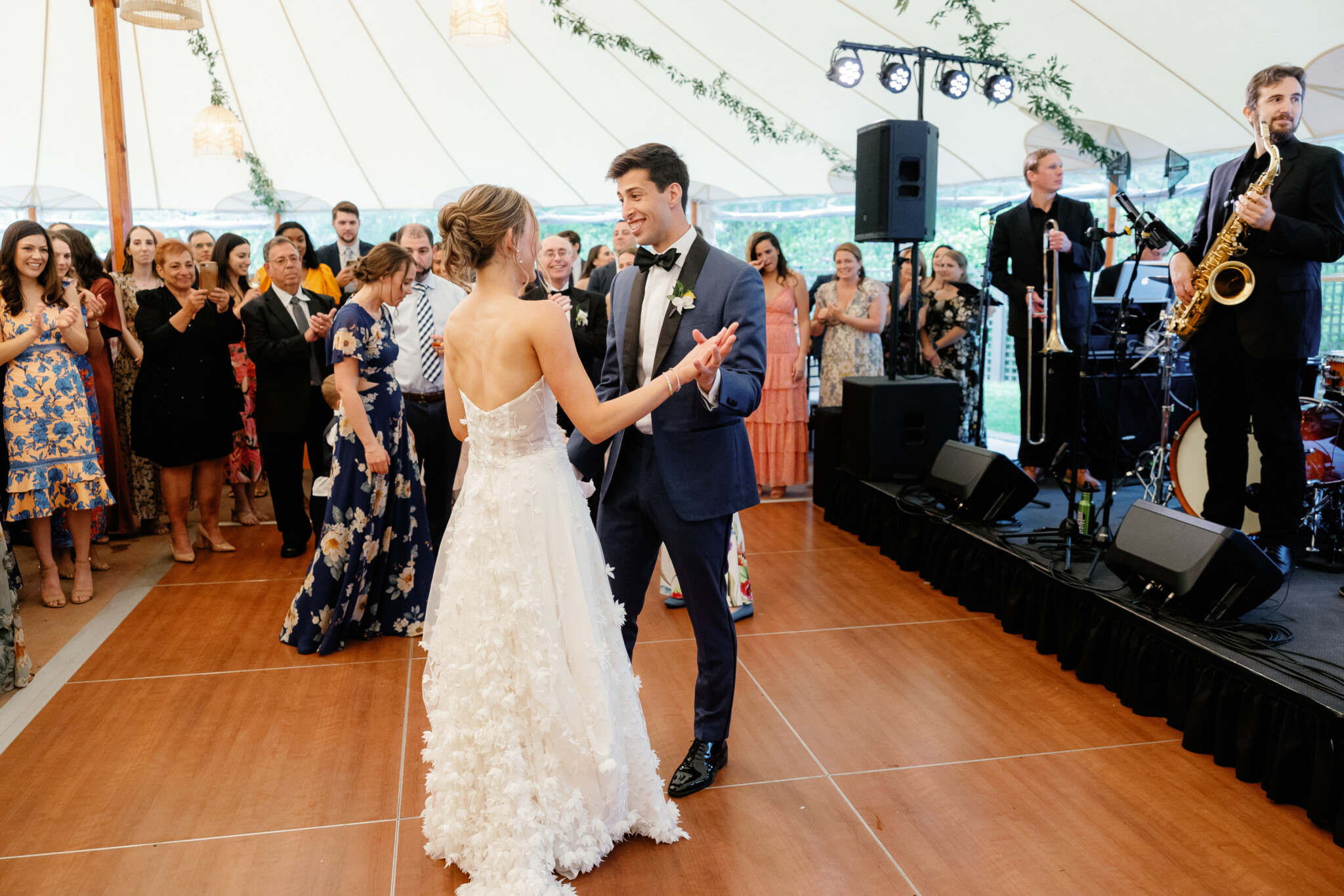 At 7:00 PM, everyone transitioned to the tent for the reception. For their entrance, Rachel and Brandon kept things simple and fun: one introduction, no wedding-party roll call. Just: